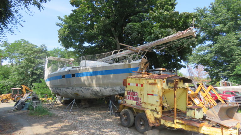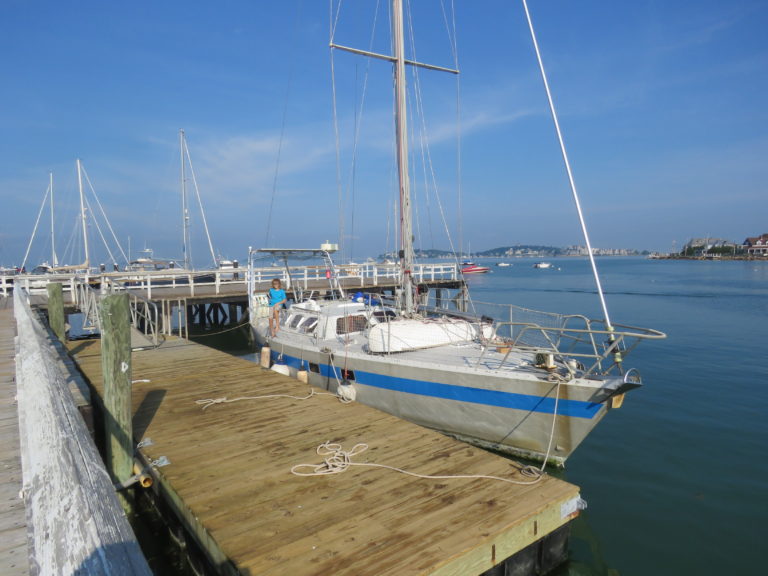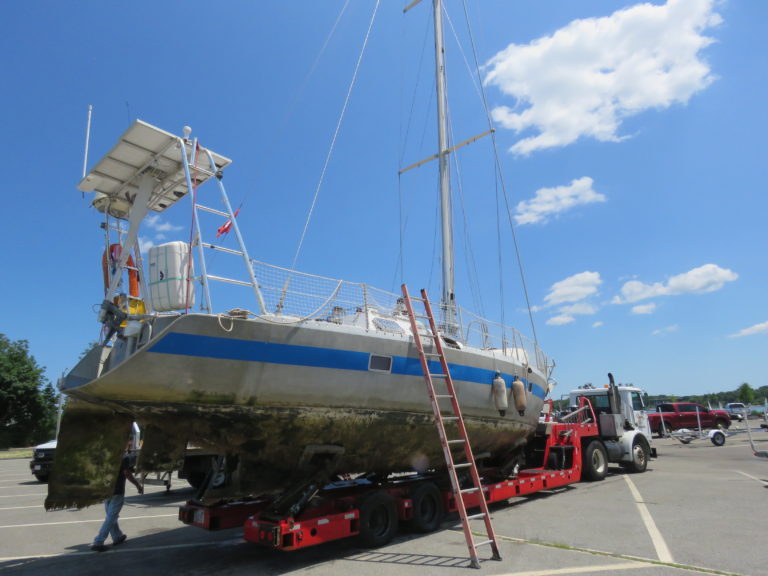 We need to get the boat out of the water and prepare it for the cold New England’s winter. On our last attempt the driver who was supposed to move our Nomad to its storage place was not very motivated to do the job. He arrived two hours late, did not say sorry nor hello, and announced in a cold and emotionless voice that we had to take off the aft arch where we carry our solar panels, wind generator and different antennas because with it we wont make it through the roads under the trees and the electric cables. Remove? what do you mean remove? Yes, just unscrew it. But ours is welded to the metal body of Nomad, and we had no intention getting out a saw and cut it off. Ok so we are all set. Says the driver. Back in the water.