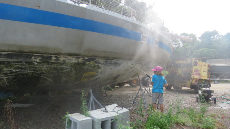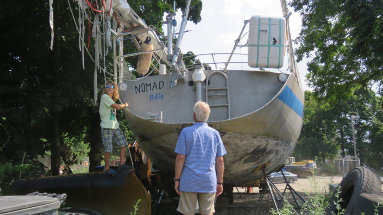 Nomad was probably only about 6 minutes out of its element before our sympathetic driver put her back in the water. The different wires that stood stiff and held Nomad’s mast in its adventures since 3 years were banging on the side of the mast. In the two hours we waited for the driver we removed all the pins and undid most of the swivels so we were ready to remove the mast. And here we were, again in the water. Nomad naked from his wardrobe. actually naked by all means – in the last weeks we emptied the boat completely. Everything – toys, books, tools, spare parts, sails, lines, blocks, clothes. Every little piece of equipment that was not bolted or welded came off. We used Jack and Claire’s little motor boat as our moving truck and everyday, when the tide was right, we would go on the boat, pack stuff, put in boxes and bags and move all this equipment into their boat, to their dock, up to their house’s garden for sorting out, cleaning and back into boxes and bags. All those things that were an integral part of our lives in the last three years. Some will come back with us to Switzerland. Most will go to Jack’s warehouse where he set us some space to put all this stuff of ours. And wow, it’s unbelievable how much stuff a 38 foot boat can have. At a certain point when we took out our spare parts and materials we were laughing with Jack that we probably have enough material to build another little boat in case Nomad had a problem…