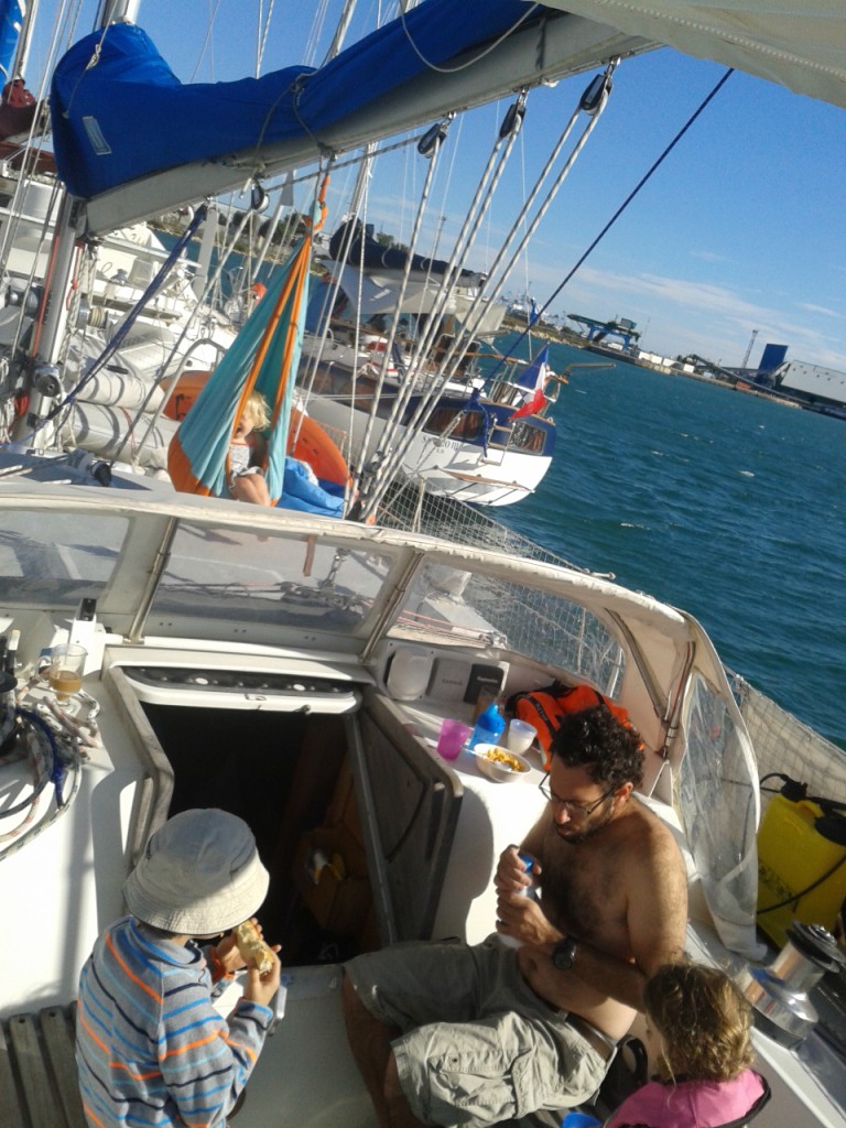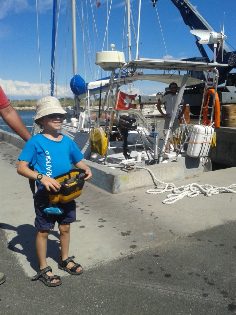 NON la nuit ne fût pas reposante, fallait pas rêver… Noa a été malade non stop avec mal à la gorge et mal dans l’oreille. Pas grave, je gère, je gère…. Il n’y a qu’a puiser dans la mmmoooonstrueuse pharmacie de voyage que nous avons à bord. 1850 chf de médicaments à bord, il y aura bien ce qu’il faut non…. Finalement nous décidons de lui donner un peu de dafalgan et de mettre une goutte d’huile d’olive dans son oreille. Parait que ça marche…