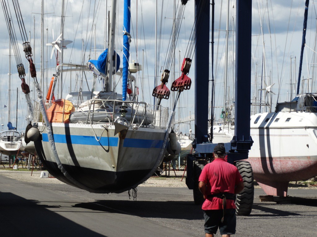 C’est encore une fois un grand moment de voir notre bateau de 10 tonnes s’élever dans les airs et prendre son chemin vers l’eau. Nous sommes émus et impatients à la fois. Stressés aussi car il y a beaucoup de vent, qu’un foutu bateau s’est amarré juste dans le passage et qu’il ne reste plus de places libres le long de Navy Service. Tant pis on fera avec!