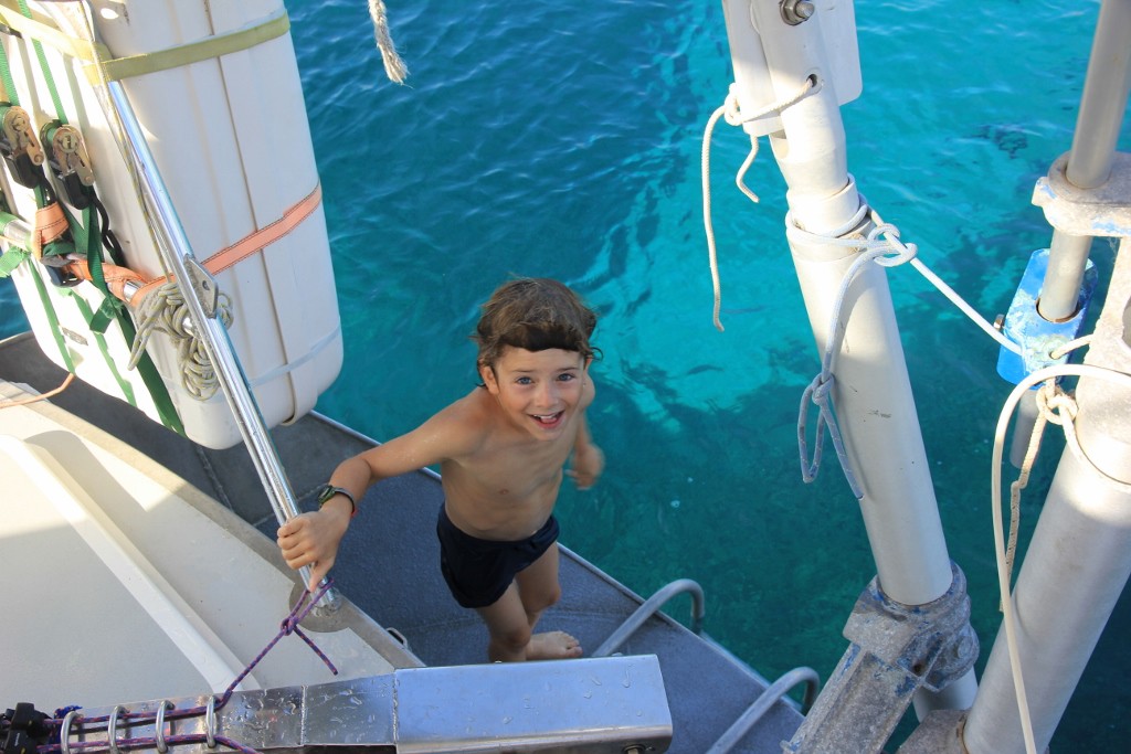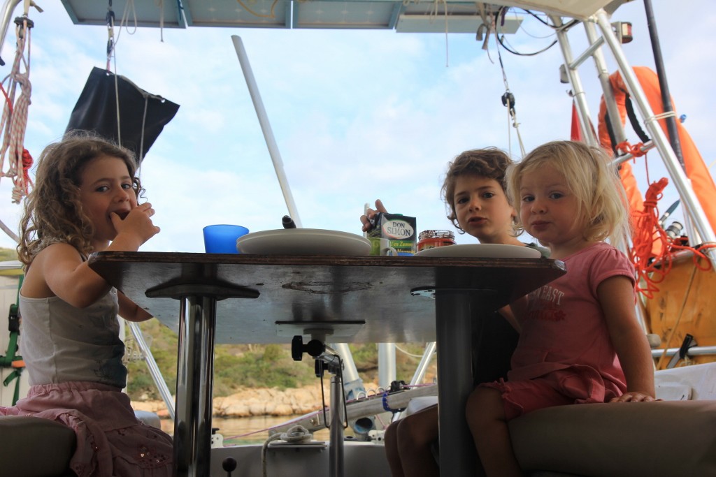 Pour manger on a une table à l’intérieur et une à l’extérieur qui est amovible. Celle dehors à un jeu d’échec aimanté sur son plateau. On l’enlève toujours pour naviguer. On n’achète pas de sandwichs. Nous avons une cuisine avec deux plaques et un four à gaz. Un frigo et deux éviers. Nous avons 4 robinets d’eau à la cuisine. Trois d’eau douce et un d’eau de mer. Un des robinets d’eau douce à deux filtres et donc c’est cette eau que nous buvons. Un deuxième a un seul filtre et nous l’utilisons pour faire la vaisselle et cuirsiner. Le troisième n’a aucun filtre. On mange comme à la maison tout normalement. On fait plein de choses : des pizzas, des gâteaux, du pain, des pâtes, du poisson et des fruits de mer, de la viande, du riz, des patates, etc…