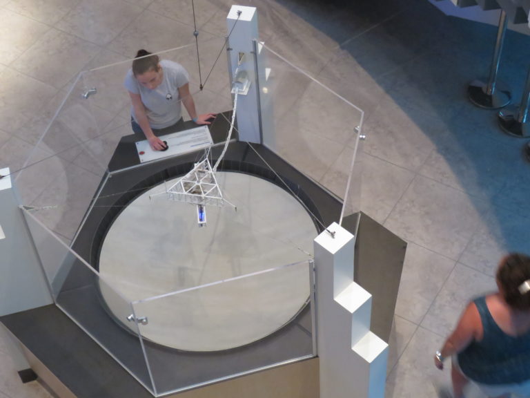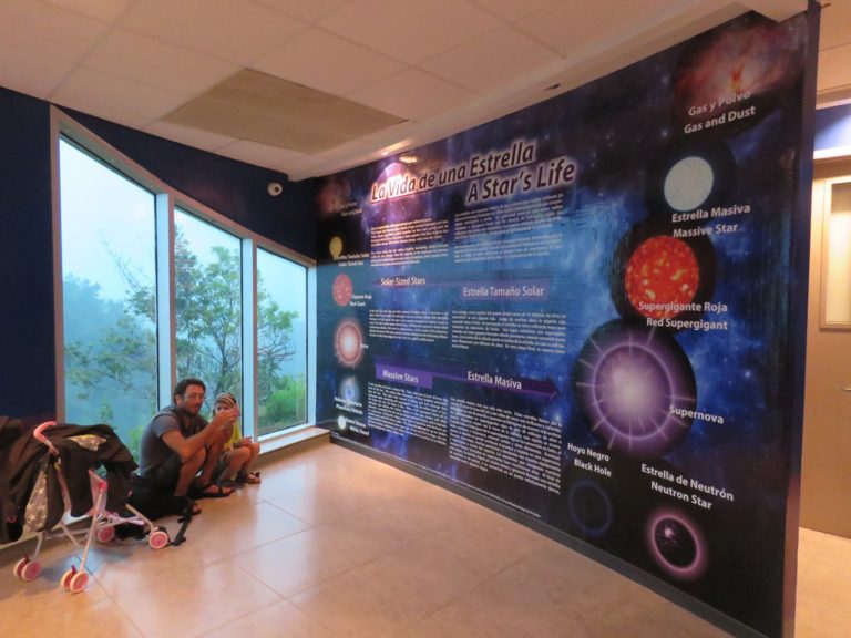 Nous sommes arrivés sous une pluie tellement battante que nous avons préféré attendre 20 minutes à l’abri au parking avant de nous hasarder à grimper les nombreuses marches nous amenant au radiotélescope. Le musée est relativement petit mais très bien fait et les enfants comme les adultes aiment. De plus le personnel est très impliqué et disponible. La plus grande merveille cependant n’est pas le musée mais la vue de l’antenne construite à l’intérieur d’une dépression et du récepteur suspendu dans les airs au milieu d’un cirque de verdure. C’est absolument époustouflant d’imaginer ces scientifiques passionnés, immergés au cœur de cette nature, les pieds au milieu des arbres, le nez levé vers le ciel et leur esprit et espoirs encore plus haut, bien bien plus haut! Ce qu’ils espèrent tous: trouver une autre terre, d’autres habitants en d’autres lieux. Des petits bonhommes, verts, bleus violets ou tout simplement comme nous, des copains venus de l’espace qui pourraient peut-être nous entendre un jour, nous voir, nous retrouver ou nous offrir une terre d’accueil le jour ou la nôtre nous laissera en plan. C’est incroyable de penser que pendant que tout un chacun se lève, déjeune, part au travail et s’occupe de sa famille, il y en a d’autres qui analysent les fréquences venues de l’espace, le souffle du lointain…
