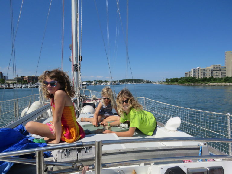 Nomad was probably only about 6 minutes out of its element before our sympathetic driver put her back in the water. The different wires that stood stiff and held Nomad’s mast in its adventures since 3 years were banging on the side of the mast. In the two hours we waited for the driver we removed all the pins and undid most of the swivels so we were ready to remove the mast. And here we were, again in the water. Nomad naked from his wardrobe. actually naked by all means – in the last weeks we emptied the boat completely. Everything – toys, books, tools, spare parts, sails, lines, blocks, clothes. Every little piece of equipment that was not bolted or welded came off. We used Jack and Claire’s little motor boat as our moving truck and everyday, when the tide was right, we would go on the boat, pack stuff, put in boxes and bags and move all this equipment into their boat, to their dock, up to their house’s garden for sorting out, cleaning and back into boxes and bags. All those things that were an integral part of our lives in the last three years. Some will come back with us to Switzerland. Most will go to Jack’s warehouse where he set us some space to put all this stuff of ours. And wow, it’s unbelievable how much stuff a 38 foot boat can have. At a certain point when we took out our spare parts and materials we were laughing with Jack that we probably have enough material to build another little boat in case Nomad had a problem…